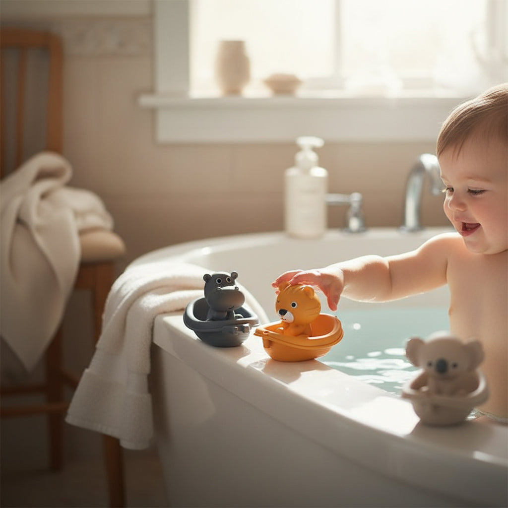 Unser charmantes Tierboote-Set kombiniert 3 bezaubernde Tierfiguren mit 3 farbenfrohen Booten. ideal für Badewannen-Abenteuer ab 2 Jahren. Jedes süße Tier bekommt sein eigenes Boot und verwandelt die Badezeit in eine spannende Reise voller Giggles und Fantasie. Die weichen, wasserfesten Charaktere sind perfekt zum Greifen und Spielen. Garantiert für strahlende Kinderaugen und jede Menge Wasserspaß!